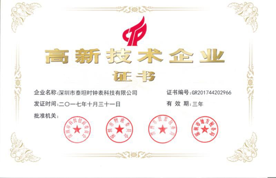 深圳市泰坦时钟表科技有限公司日前已顺利通过国家高新技术企业认定,获得“国家高新技术企业”荣誉称号。